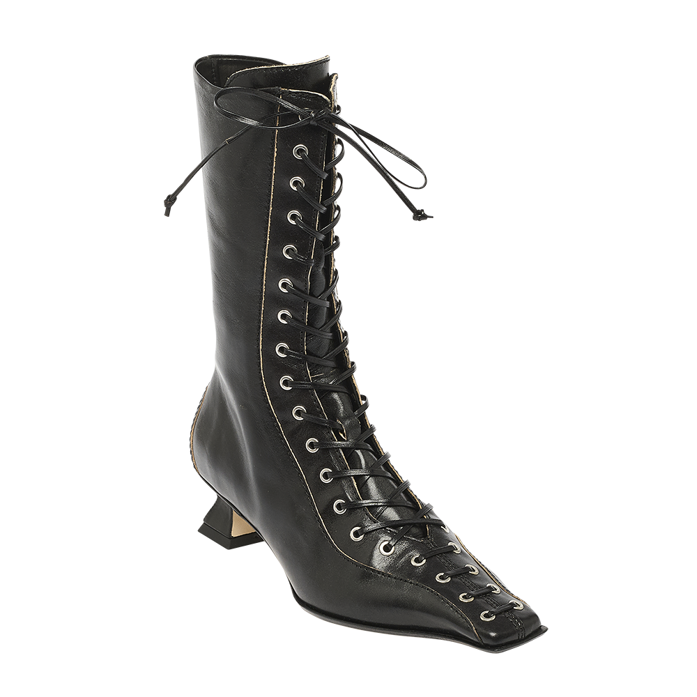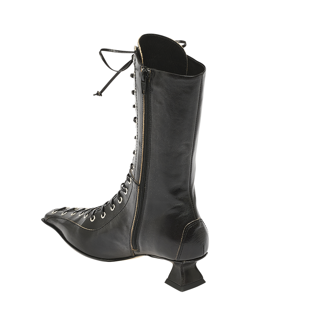 Émile est une bottine zippée ajustée qui revisite le style parisien du XIXe siècle aux Folies Bergère. Dotée d'une semelle fine et d'un talon moyen sculpté, elle est confectionnée en cuir naturel à bords francs et ornée d'œillets qui descendent sur l'avant de la botte, du haut jusqu'au bout carré galbé.