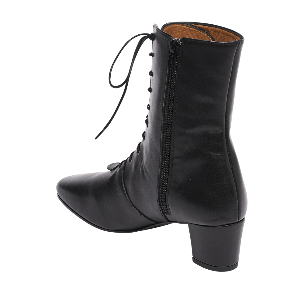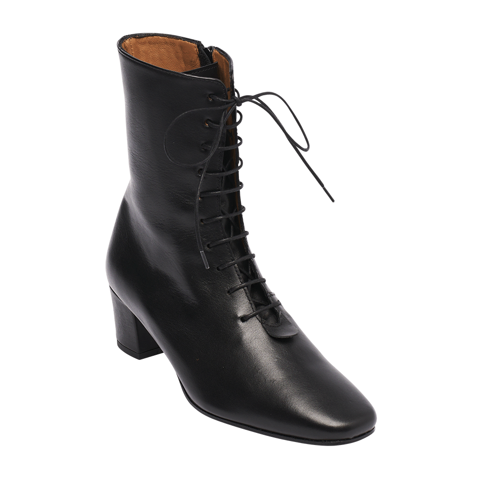 Bottine à lacets en cuir lisse et fermeture éclair. Semelle et doublure en cuir. Talon épais recouvert. Fabriquée au Portugal. Hauteur : 4.5 cm