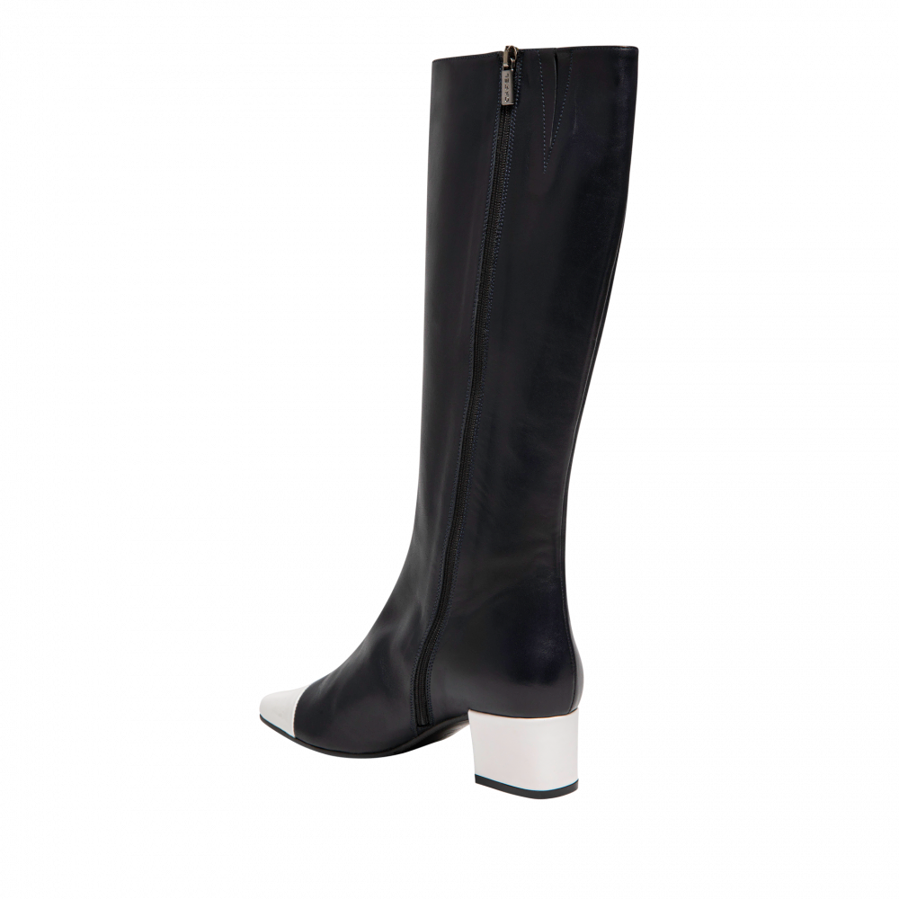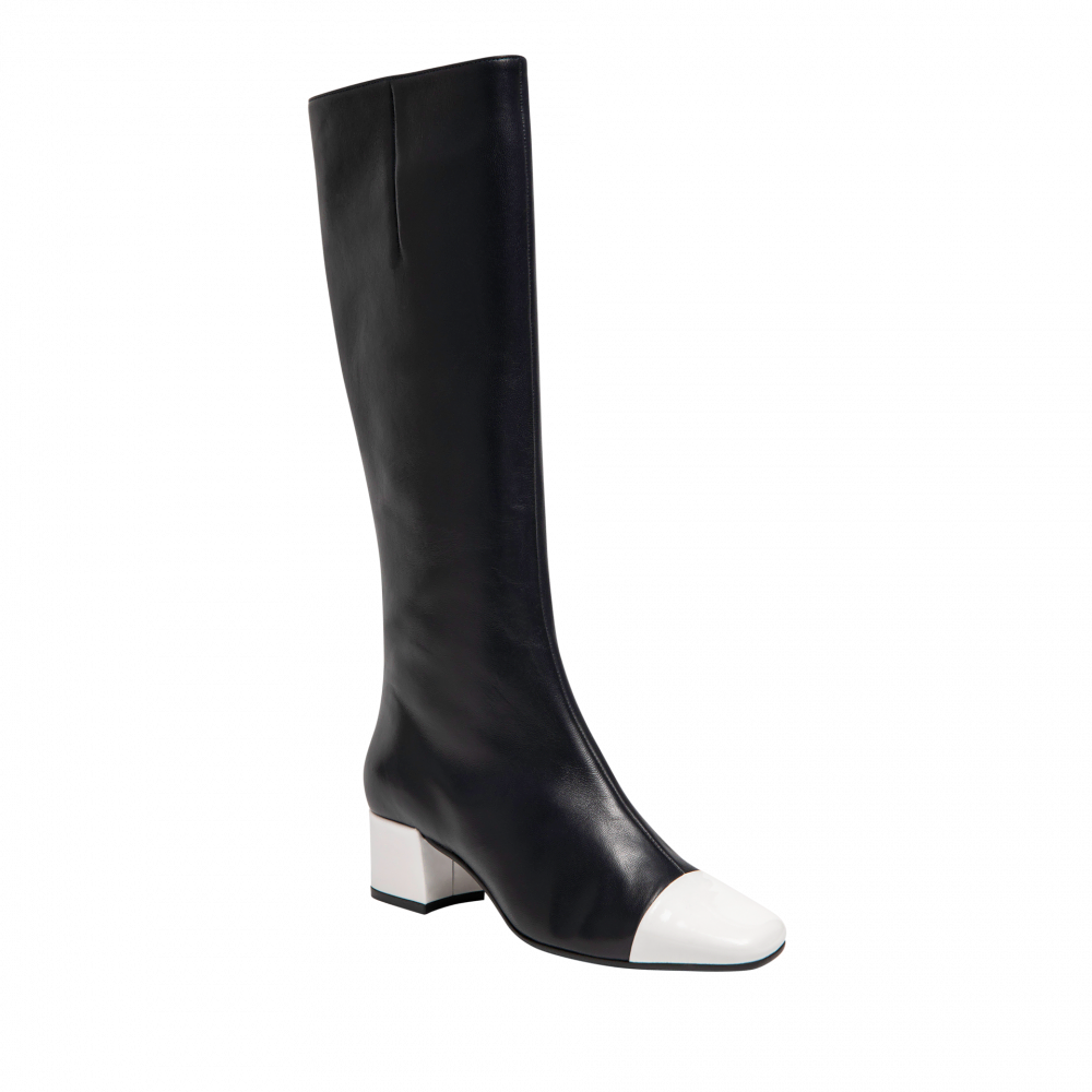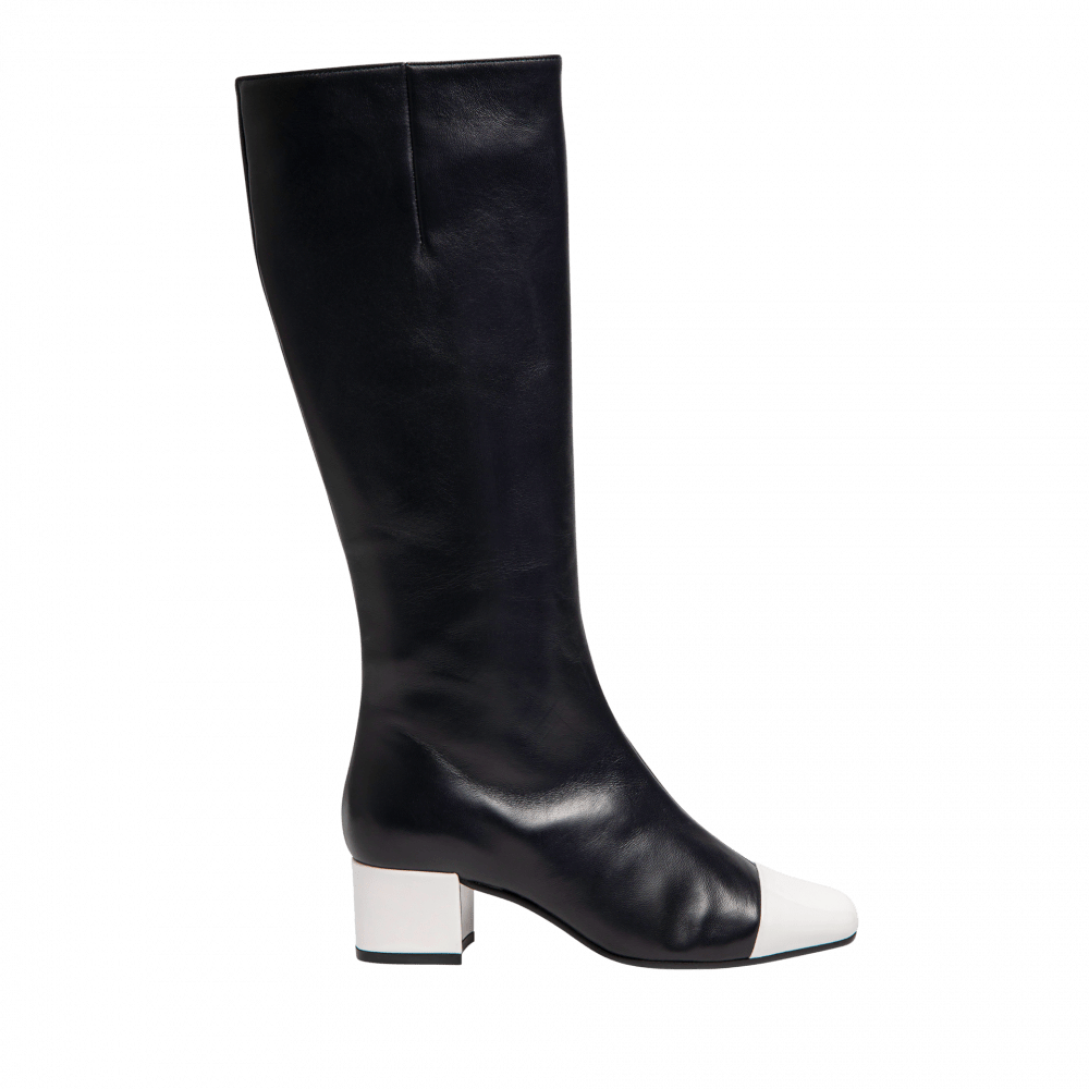 Bottes moulante en cuir lisse et bout vernis. Bottes à fermeture éclair sur le coté intérieur. Semelle en cuir et gomme. Fabriquée de manière artisanale en Italie. Hauteur : 4 cm