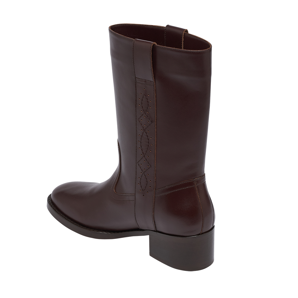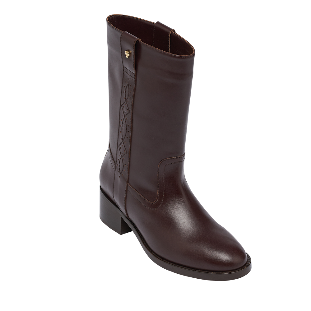 Une bottine sobre et élégante, aux faux airs de camarguaise. Ses lignes droites, rehaussées de découpes sellier et adoucies par la rondeur de son bout, lui donnent une allure affirmée. Un subtil jeu de découpes et de surpiqûres orne sa tige. Elle se porte aussi bien sur un jean qu’avec une robe fluide.