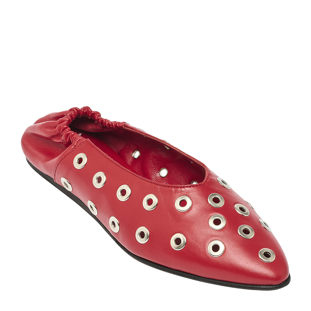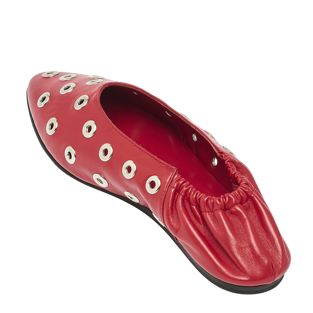 Ballerines en cuir de chèvre souple, tige ornée de clous en métal argenté, avec trépointe de protection et semelle légèrement rembourrée pour un confort longue durée. Leur conception permet de les porter comme des ballerines classiques ou comme des mules ouvertes.