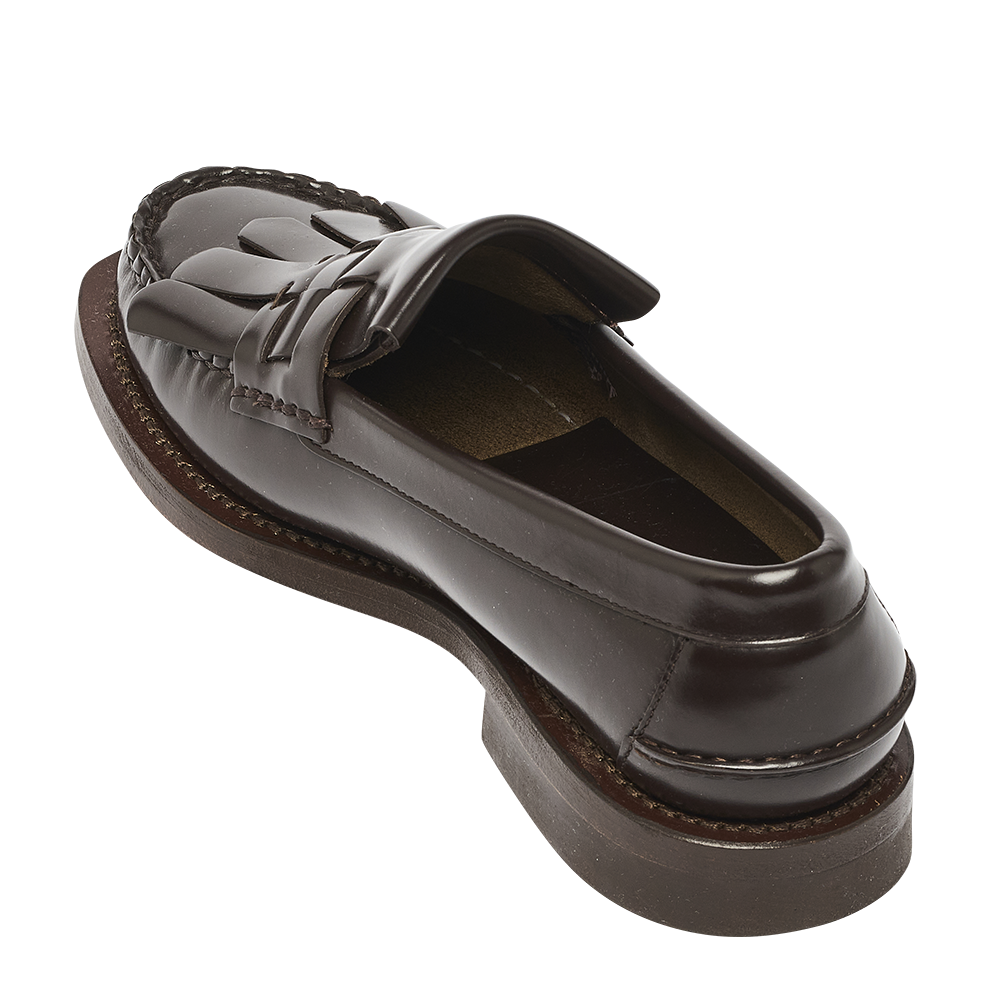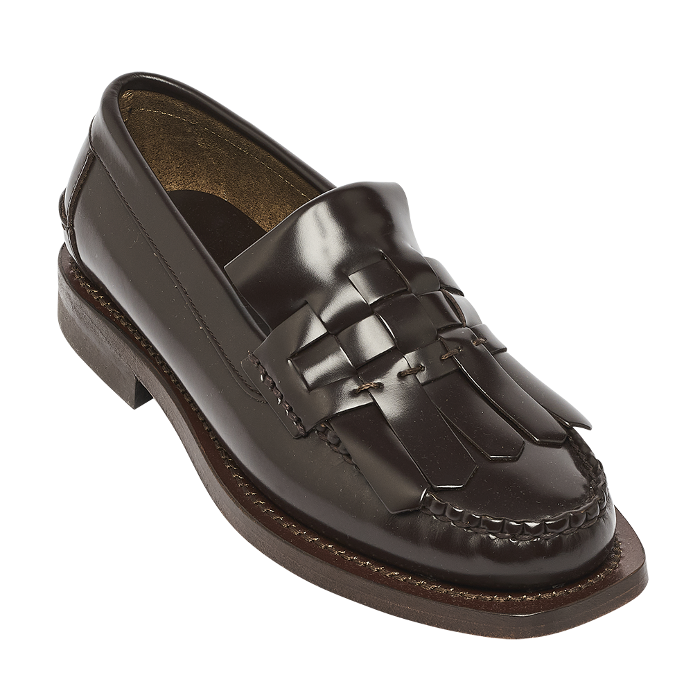 Mocassins à enfiler avec franges entrelacées, confectionnés en cuir de veau structuré.