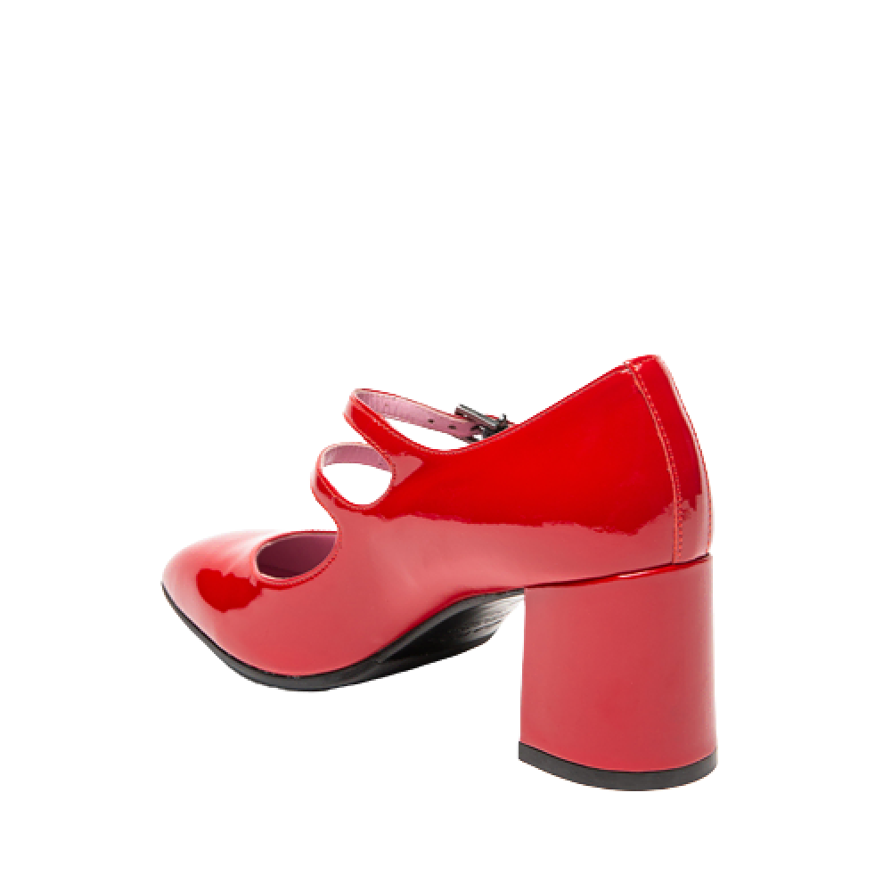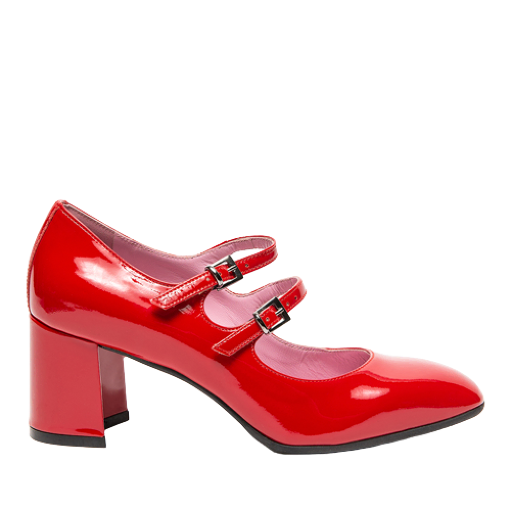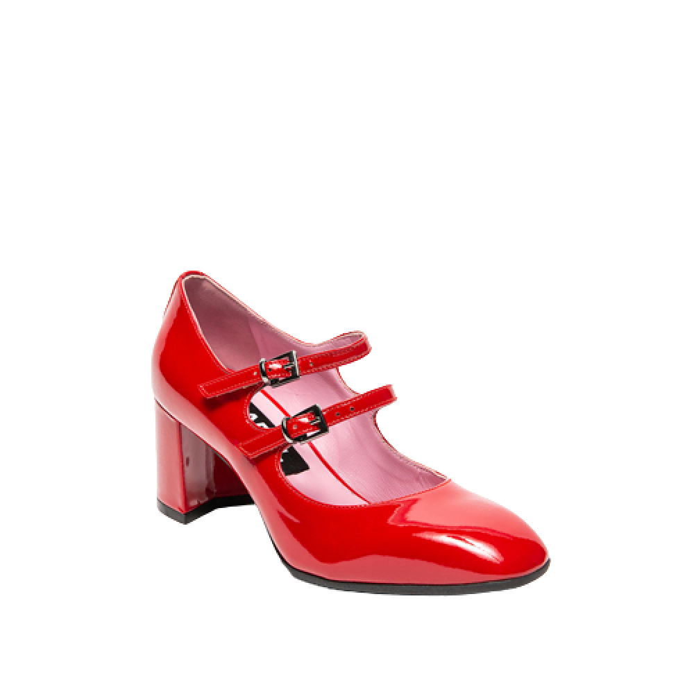 Babies en cuir verni. Double bride ajustable sur le coup de pied. Boucles argentées. Doublure en cuir. Semelle en cuir et caoutchouc. Talon épais en cuir verni. Fabriquée en Italie.