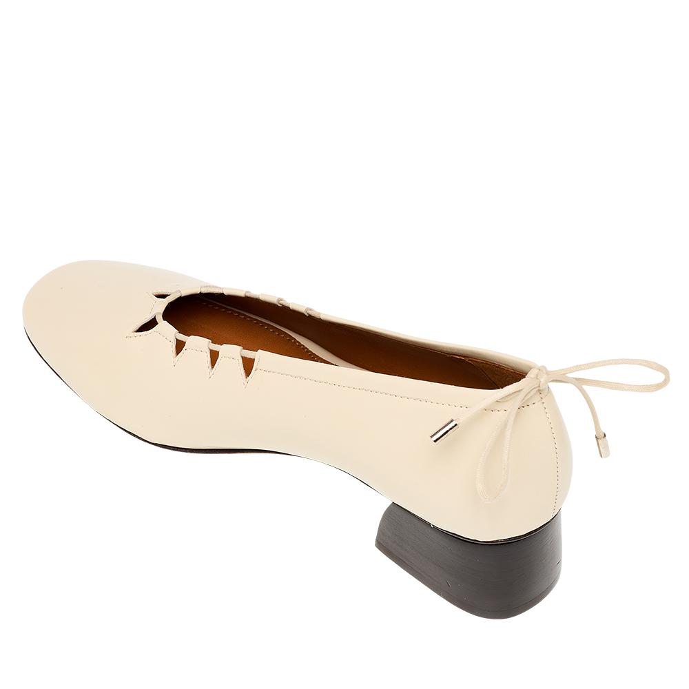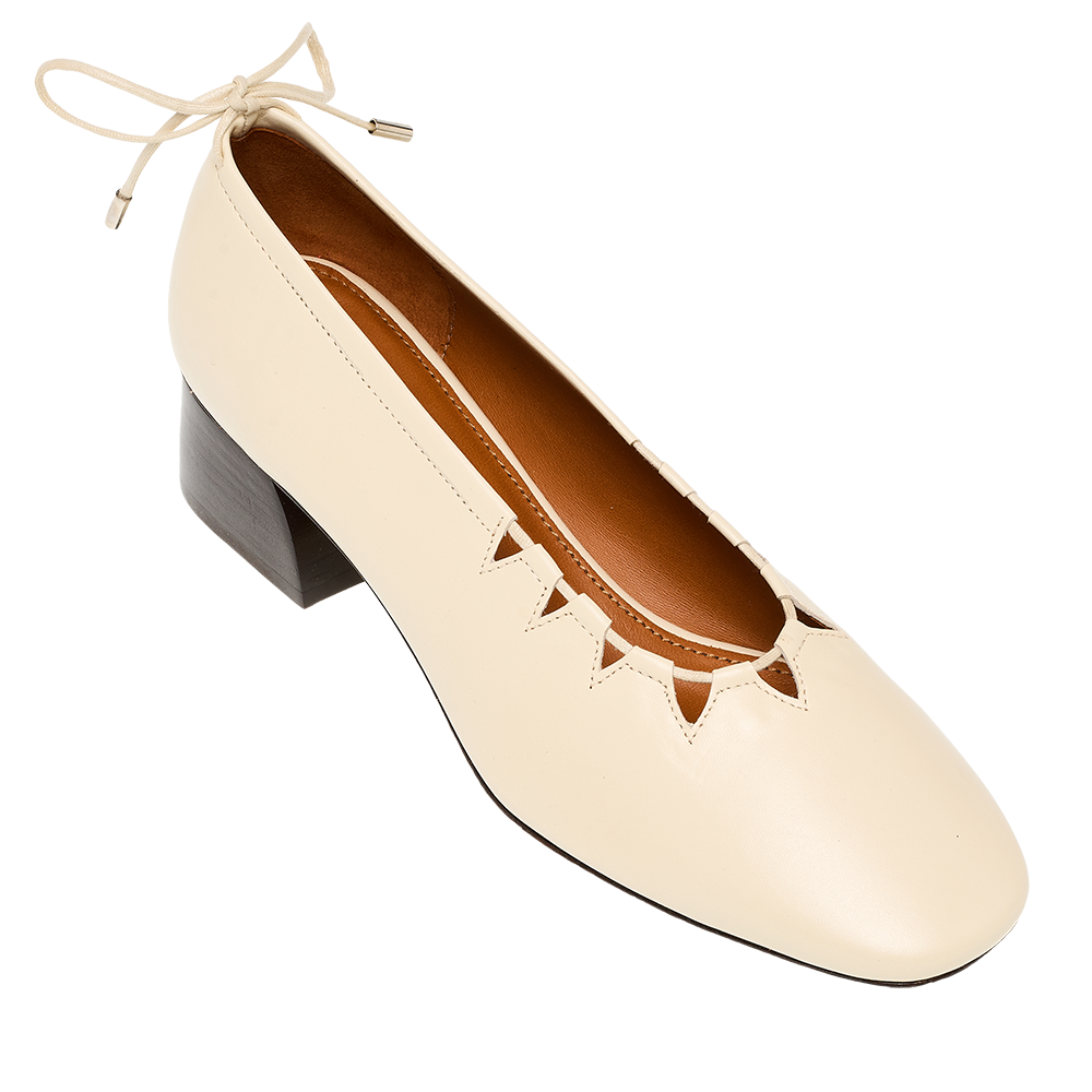 Moune réinterprète la ballerine à talon avec caractère. L’harmonie subtile entre sa tige souple et son talon structuré, soulignée par un délicat jeu de découpes, lui confère une allure affirmée. Un lien arrière permet d’ajuster le chaussant pour un confort sur mesure. Confectionnée en cuir d'agneau très souple et dotée d'une semelle moussée, elle fait un parfait allié du quotidien.