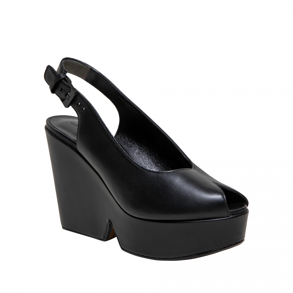 Sandale compensée en cuir d'agneau très souple. Open toe à l'avant du pied. Bride à boucle ajustable à l'arrière du talon. Talon épais compensé recouvert en cuir. Fabriquée en France. Hauteur : 11 cm et 4.5 cm de plateau