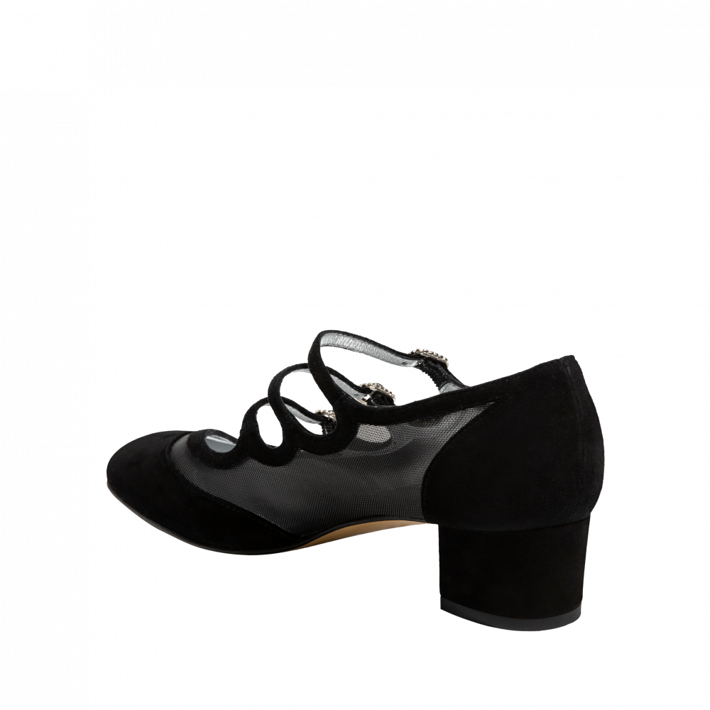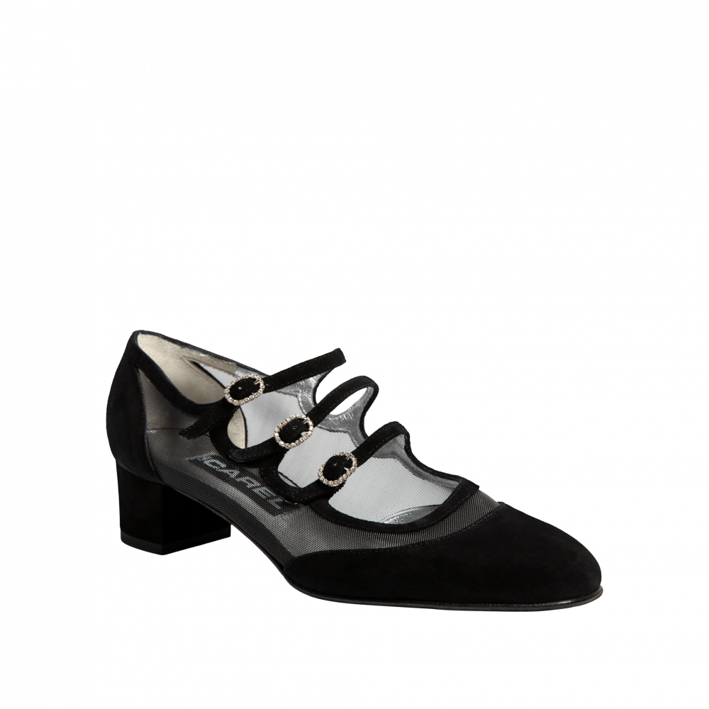 Babies à triple bride emblématique de la maison Carel en cuir velours et résille. Boucles argentées à strass. Doublure et semelle en cuir. Talon épais recouvert. Fabriquée en Italie. Hauteur : 4.5 cm
