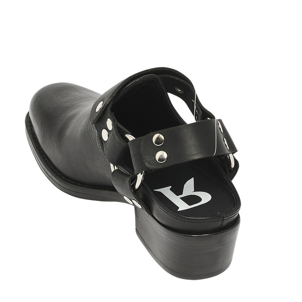 Mules en cuir lisse ornées d'une boucle, d'un anneau métallique et de détails d'inspiration motarde. Leur design ouvert et leur talon large leur confèrent une allure audacieuse et une excellente stabilité.