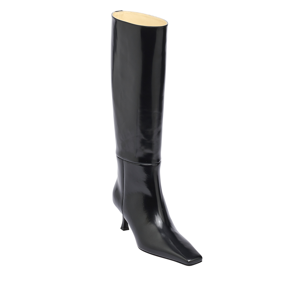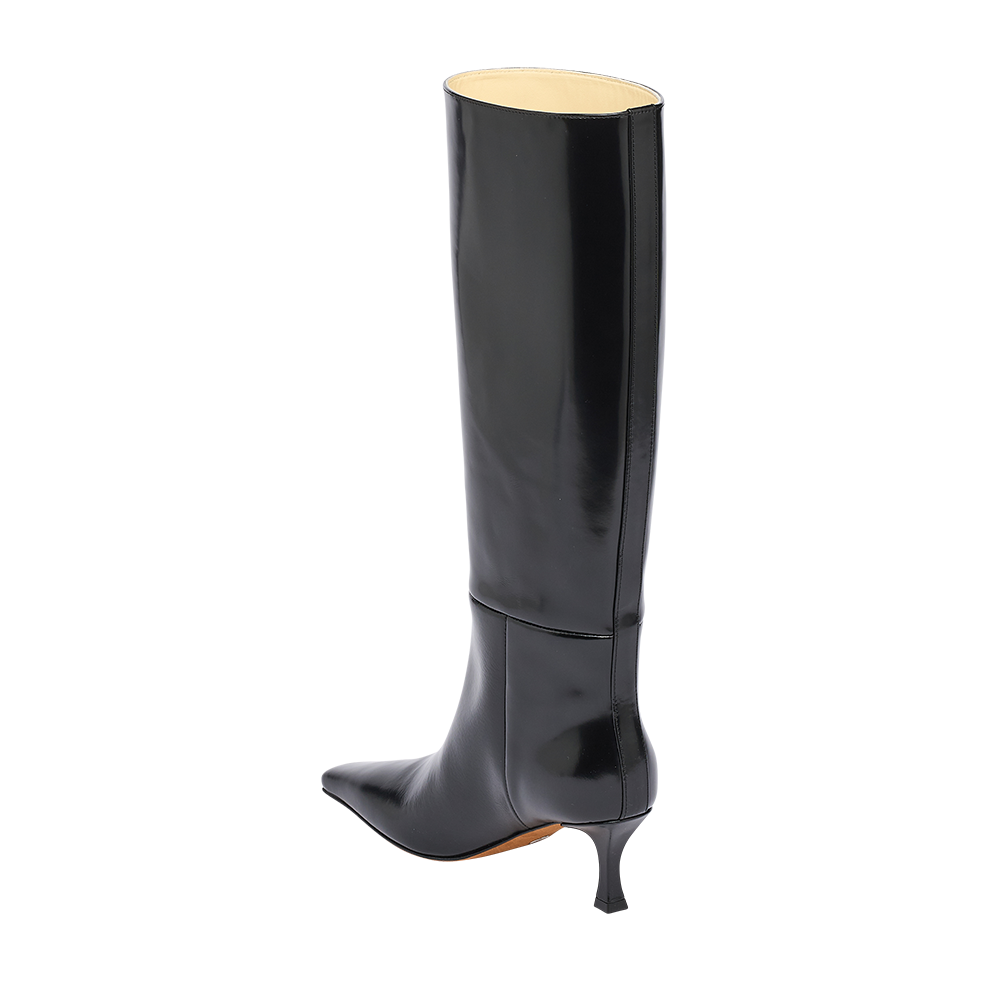 Les bottes Trap sont confectionnées en cuir spazzolato et présentent une silhouette montante jusqu'au genou avec un bout fin en forme de trapèze.