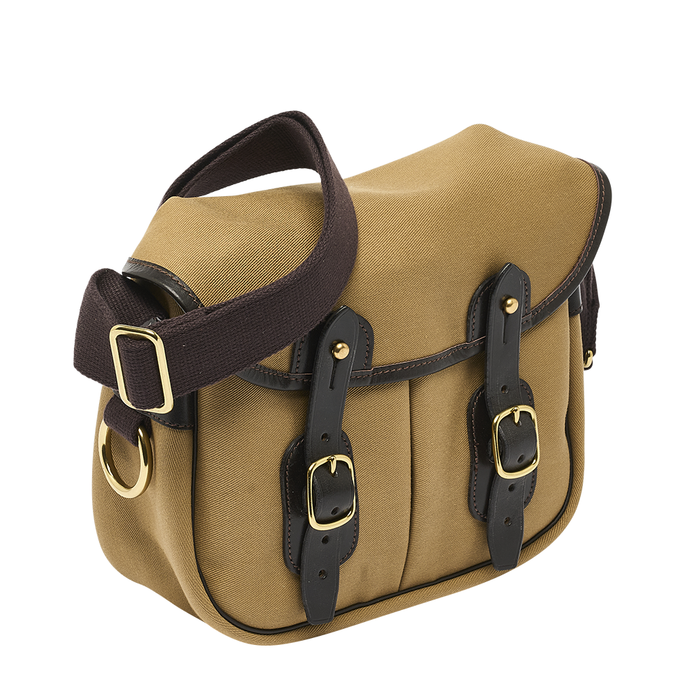 Le modèle est soigneusement fini avec des ferrures en laiton et une bandoulière réglable en coton.